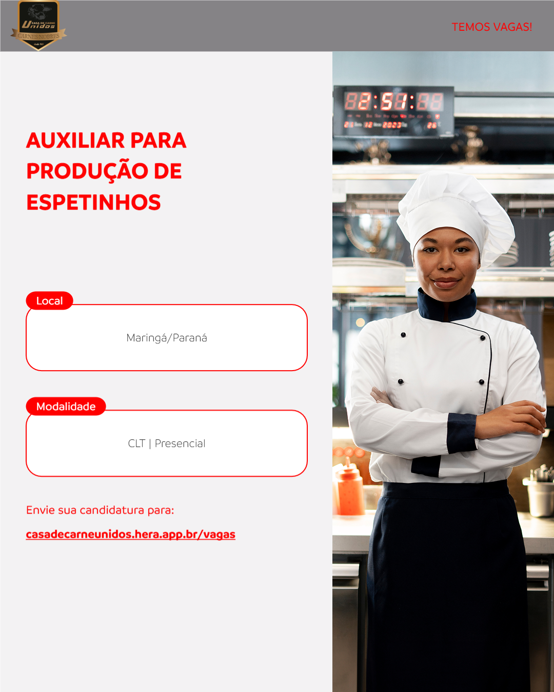 Estamos em busca de um Auxiliar de Produção para atuar na preparação e montagem de espetinhos. O profissional será responsável por apoiar todas as etapas do processo produtivo, garantindo qualidade, organização e agilidade no trabalho.